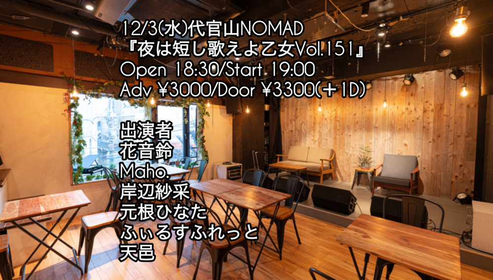 東京🗼12/03(水)代官山NOMAD 『夜は短し歌えよ乙女Vol.151』に出演します🎤✨